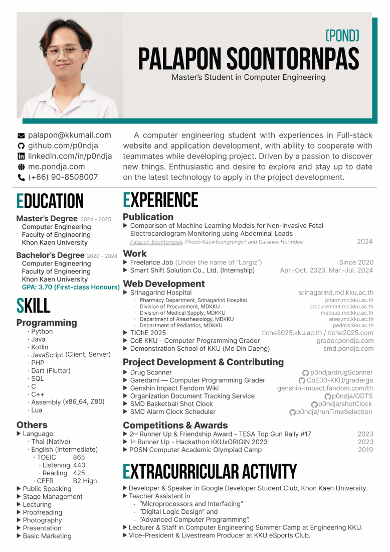 View AlbumThe Academic Olympiad and Astronomical Olympiad Camp, commonly known as "Camp Sor-or-wor-nor," (สอวน.) played a significant role for me in developing a serious interest in computer programming. During the camp, I learned various programming skills in C and C++ from teachers, senior camp members, and my peers. This was my first exposure to studying C and C++, as my previous programming experience had started with Java, which is known for its full-fledged Object-Oriented Programming (OOP) approach. This was different from others who often begin with C, a language oriented towards Structured Programming. Through this experience, I gained valuable insights and applied them to enhance various programs I had previously developed.
